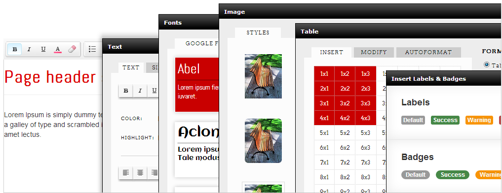 The Editor is based on InnovaStudio's Editor (www.innovastudio.com), and specially customized for Bootstrap framework.
